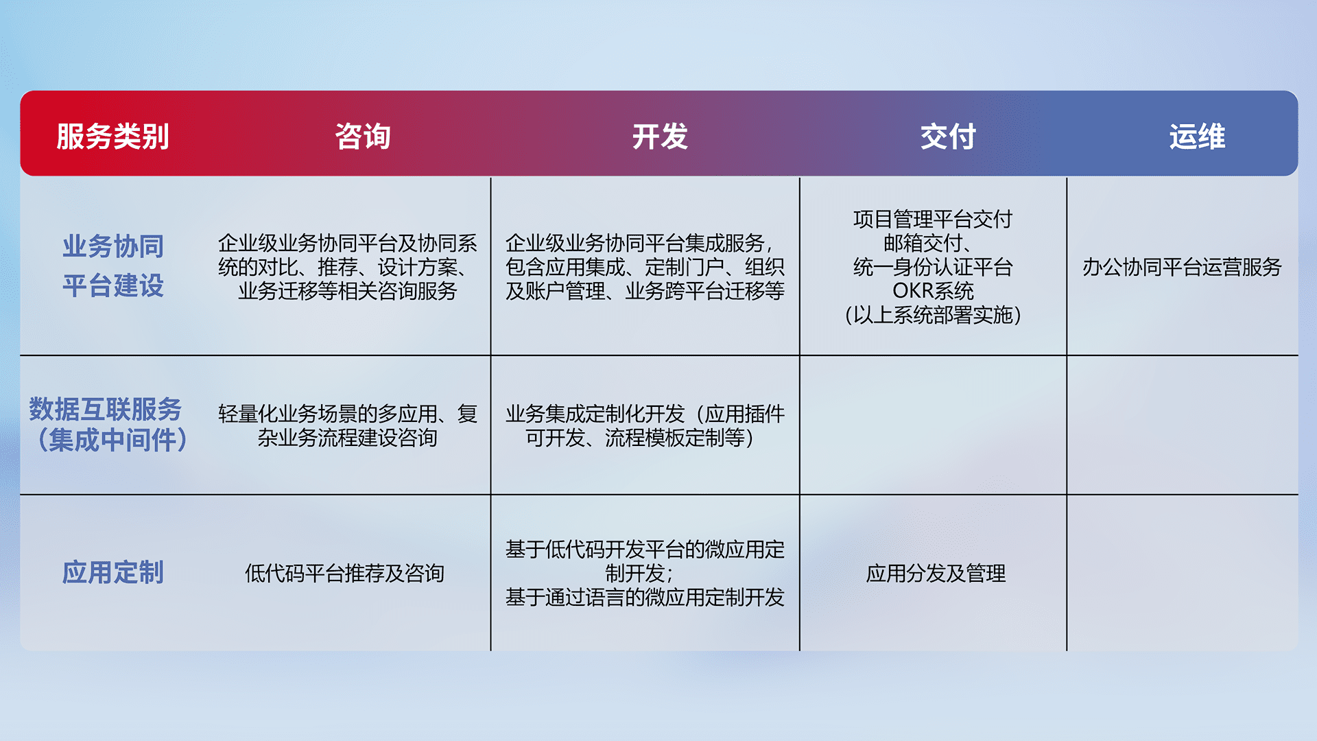 针对钉钉、、、、企微、、IDaas等平台级产品提供产品的规划、、、、方案、、、、交付、、、、定制化开发等服务,,,实现如统一协同办公、、、、智能客户服务、、、混合会议管理、、、智能数据查询、、、等业务场景,,,实现数字化转型。。。。