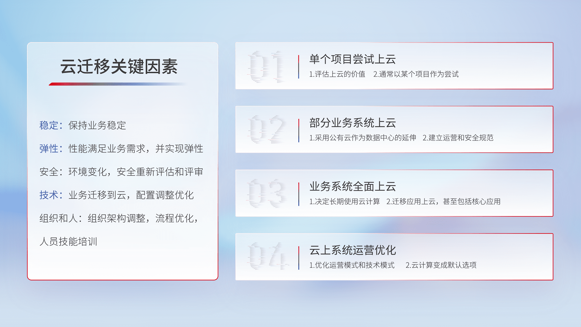 结合实际业务,,,从规划设计、、、云平台选型、、、、云原生改造、、、数据迁移、、、、集成交付,,,,迁移全过程为客户识别最佳上云路径,,,,做好风险识别管理,,,设计网络架构、、、身份权限、、、安全审计合规、、、、操作审计、、日志审计、、、监控告警策略、、多站点容灾设计等,,,,对云上基础设施进行整体规划,,,提升IT治理水平,,以满足弹性、、、、高可用、、、高性能的需求。。。