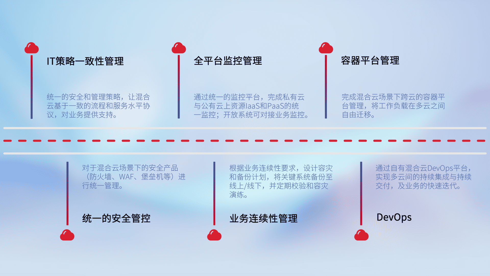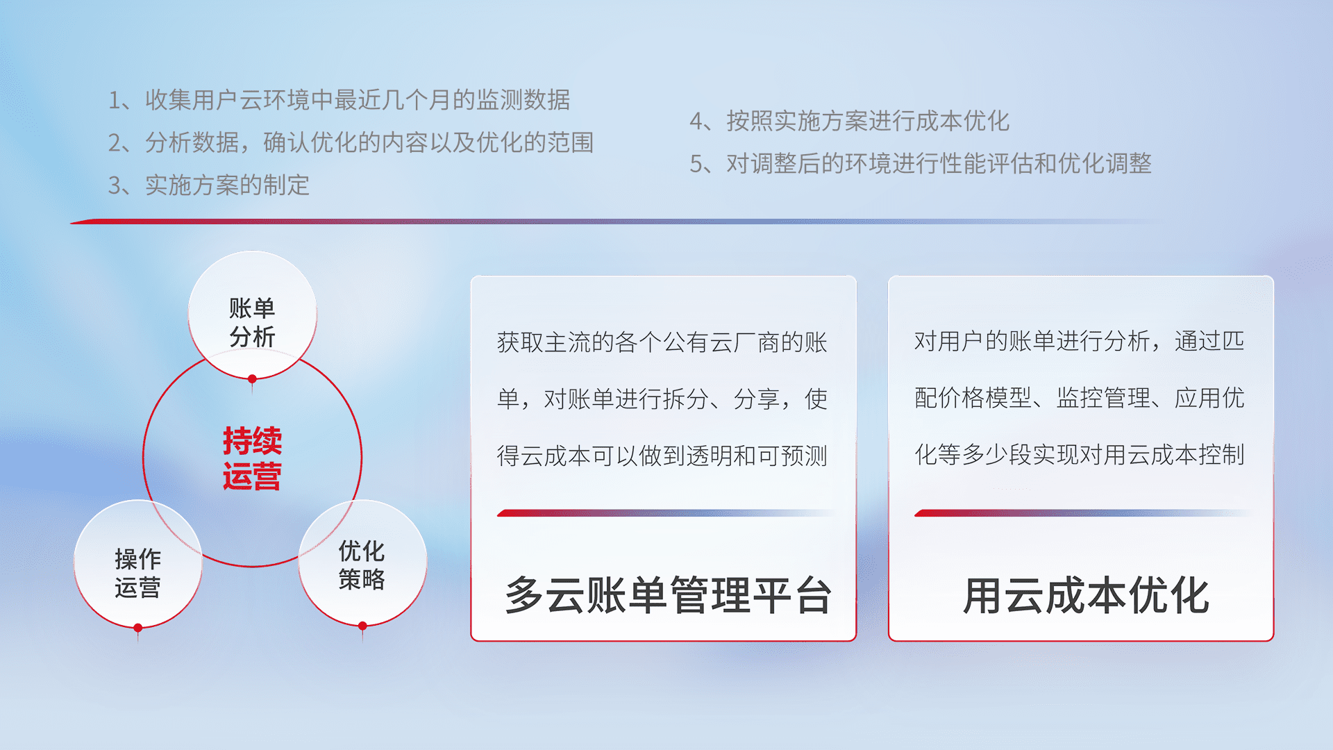 通过多云纳管,,,以统一的资源数据模型把客户的云资源进行抽象和封装,,进而实现对多云资源的统一操作,,保障云资源管理的可靠性、、、稳定性与可用性。。量身定制化运维内容,,,配置、、开发运维、、补丁管理、、、备份、、、、监控、、、认证和访问管理、、、审计和日常巡检等,,,保障在用云过程中的可靠度,,,,稳定度以及高可用率。。。。